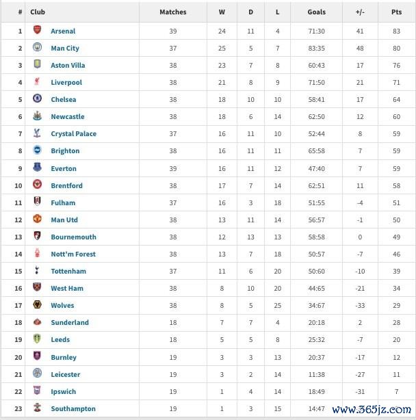 博星配资 英超2025年积分榜:阿森纳83分居首,曼城第二利物浦第四