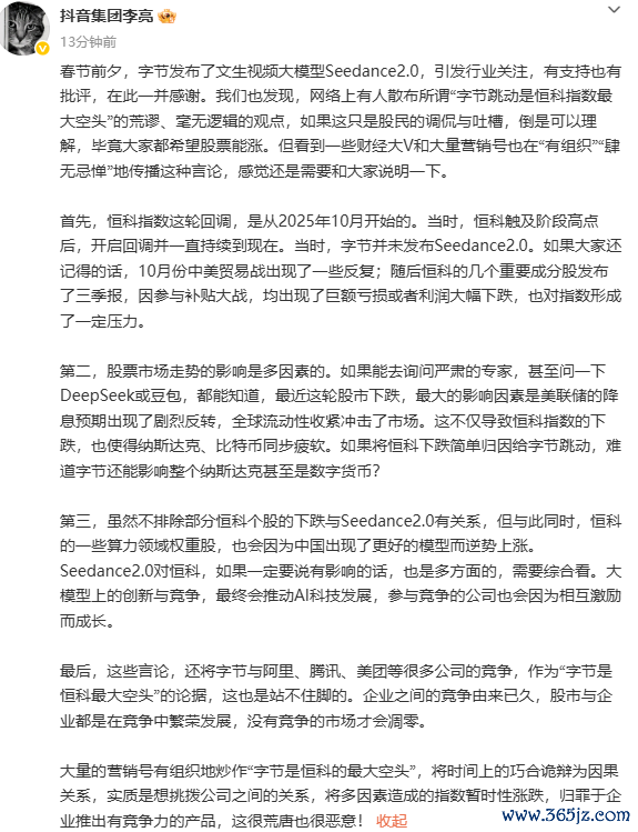 抖音集团李亮:炒作“字节是恒科的最大空头”很荒唐也很恶意抖音集团李亮:炒作“字节是恒科的最大空头”很荒唐也很恶意
