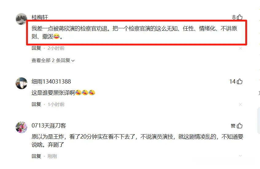 她所饰演的郑雅萍人设是疾恶如仇,雷厉风行的女检察长,但是却被她演得像是一个无理取闹的泼妇一样。